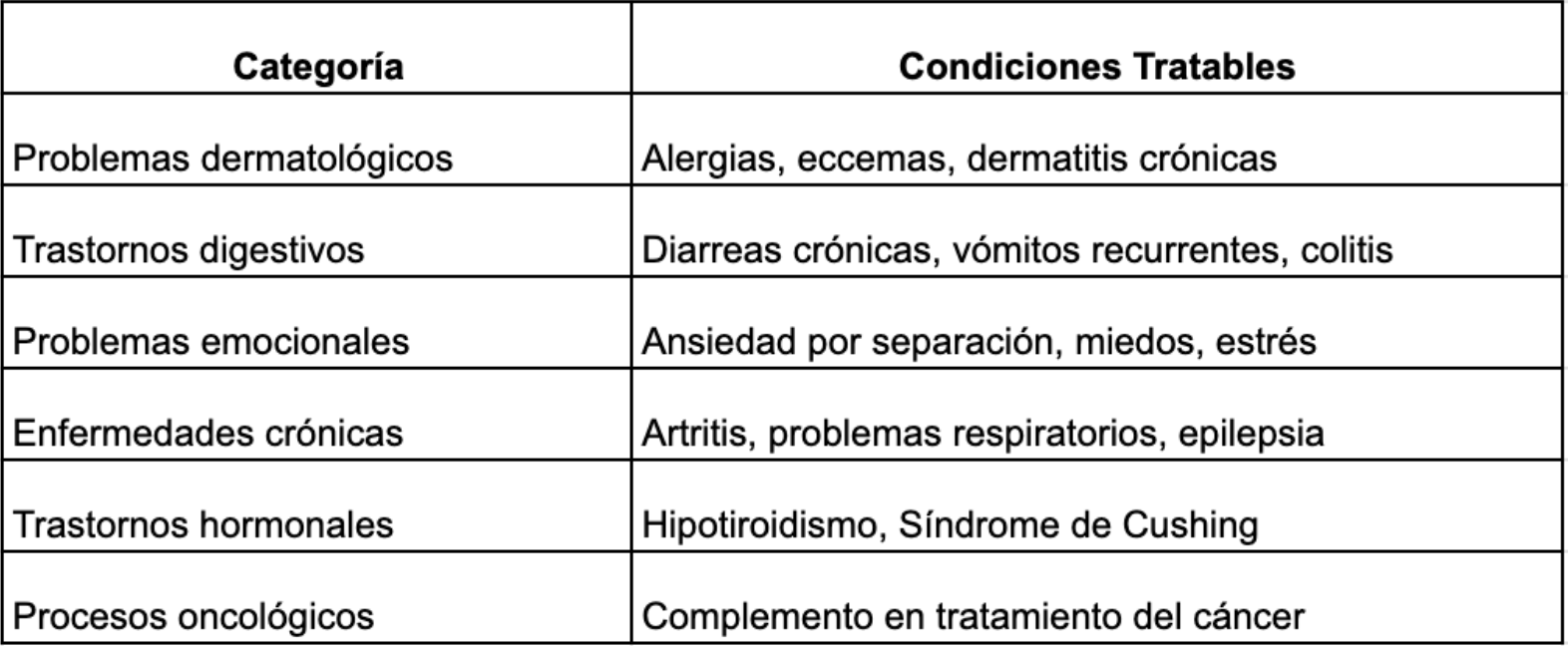 - Control de trastornos metabólicos y hormonales: Se han obtenido excelentes resultados en el manejo de hipotiroidismo, hiperadrenocorticismo (Síndrome de Cushing), y otras alteraciones endocrinas.